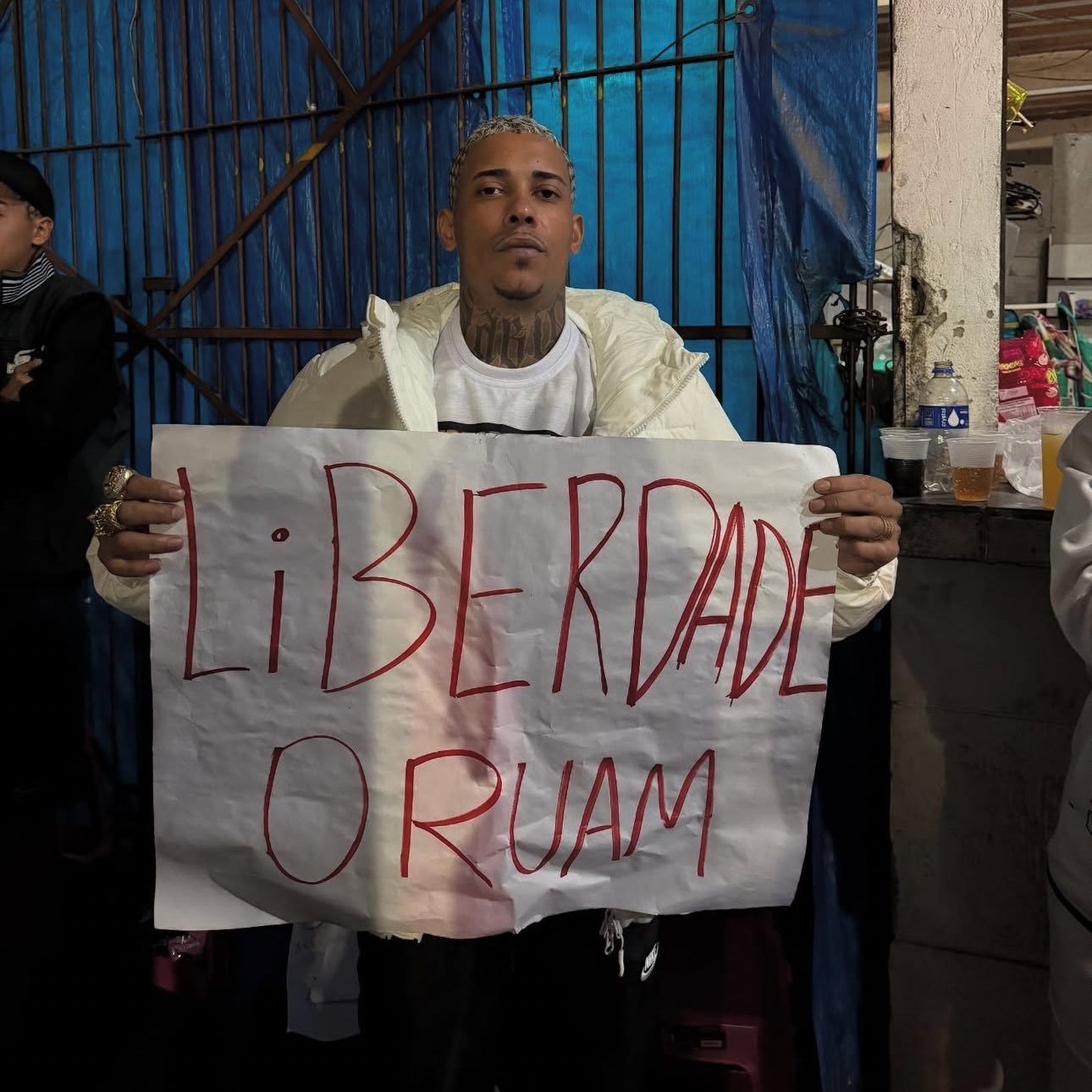 A manifestação, realizada mesmo sob forte chuva, reuniu amigos, fãs e familiares do artista, incluindo sua noiva, Fernanda Valença. Com cartazes nas mãos e camisetas estampadas com a imagem de Oruam, o grupo clamava por justiça e pedia a libertação do cantor.